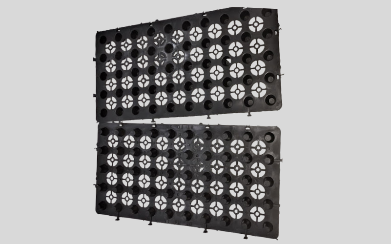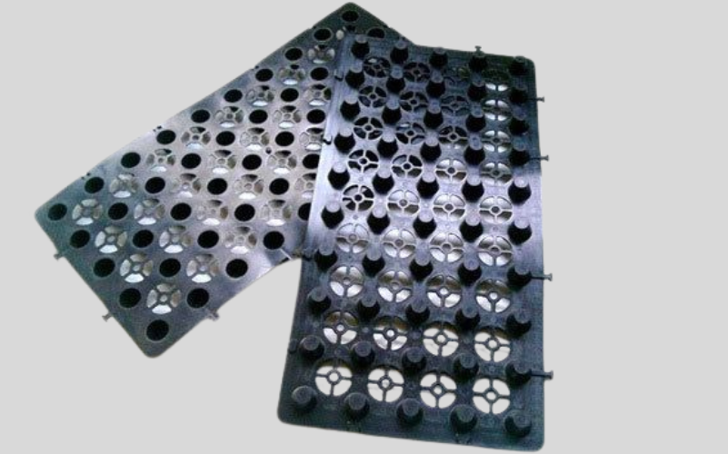Flexo drain boards are a lightweight, high strength modular Flexo drain boards which is especially designed for sub-surface drainage and waterproofing membrane protection. Flexo drain boards are manufactured from high strength polypropylene. The Flexo drain boards also acts as a protection layer over waterproofing membranes, and also creates a thermal insulation barrier. The open surface design and high internal void volume enables the rapid capture and transport of high water volumes. The Cups designed in the Flexo drain boards can store little water also. The roots of plants and grass can take this water through Capillary action and will help in the growth of these plants.